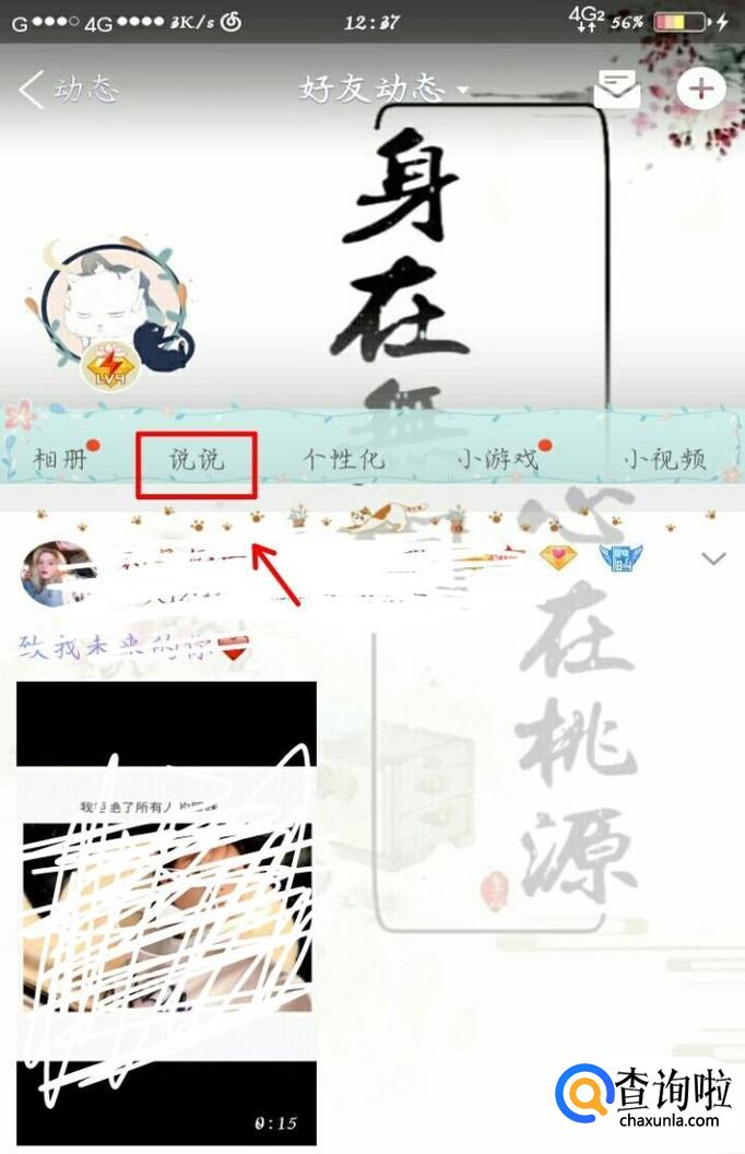 我们在好友动态中看到的第一条说说,它的上方就是自己的空间内容,我们点击第二个“说说”并进入说说内容。如图所示。