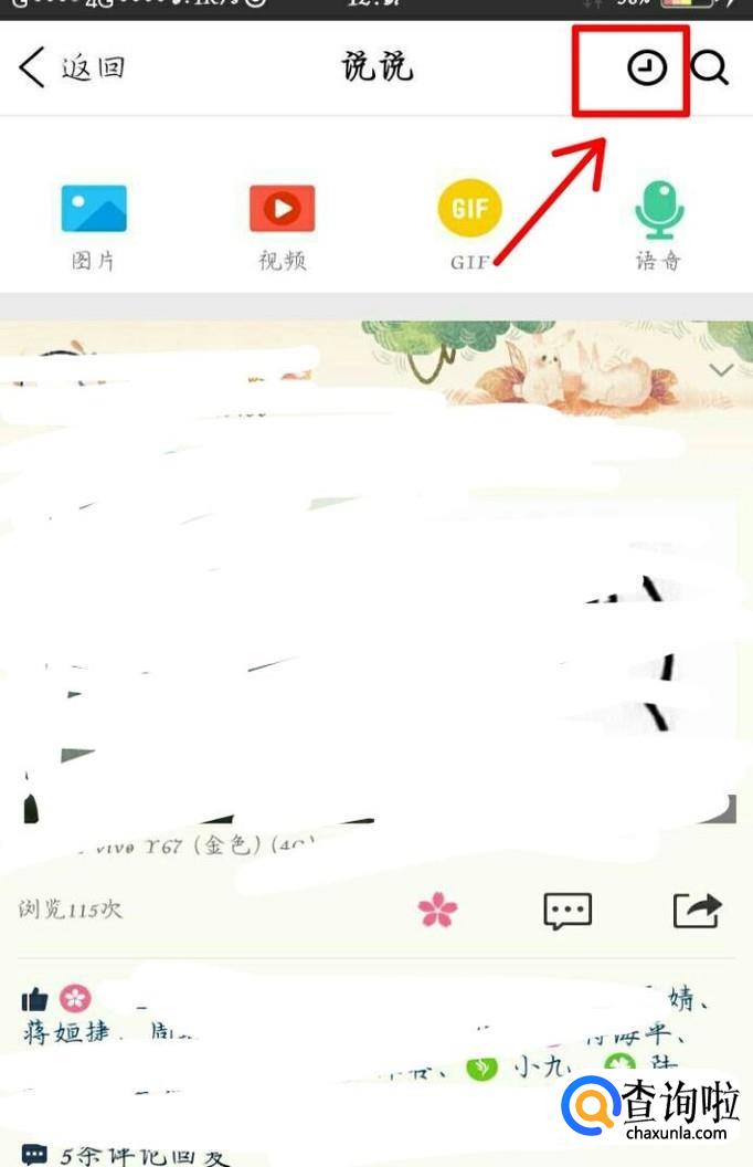 我们再说说内容中,可以看到它的左上角有一个时间的图案,我们点击进入时间图案就可以看到我们发布的定时说说。如图所示。