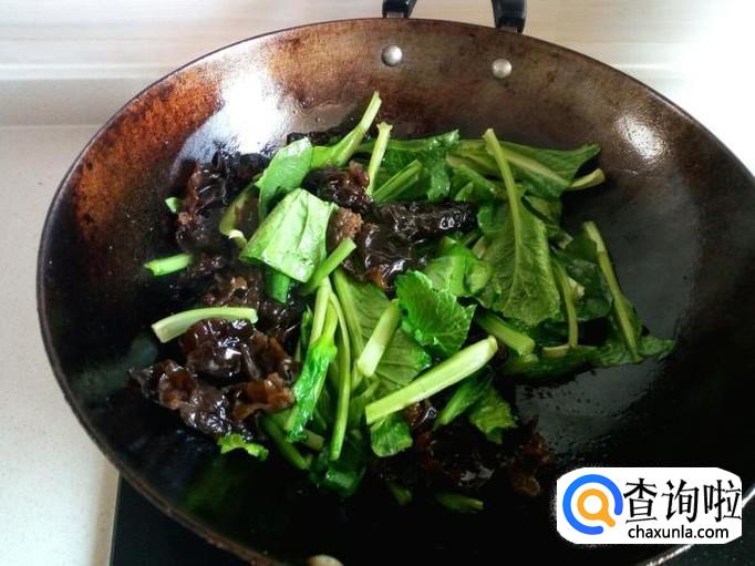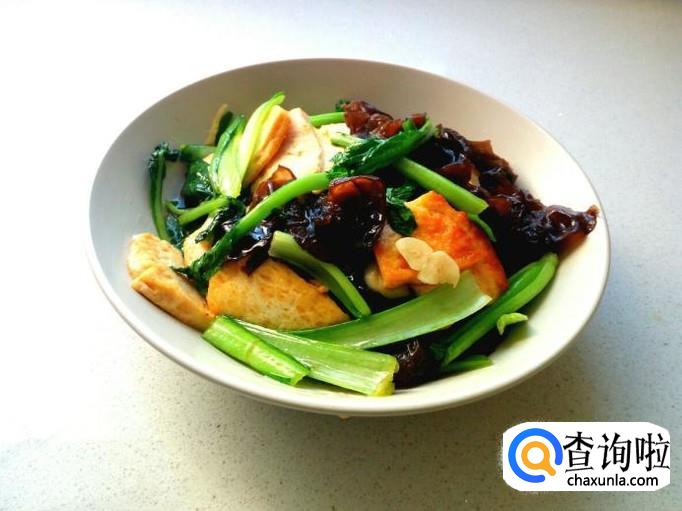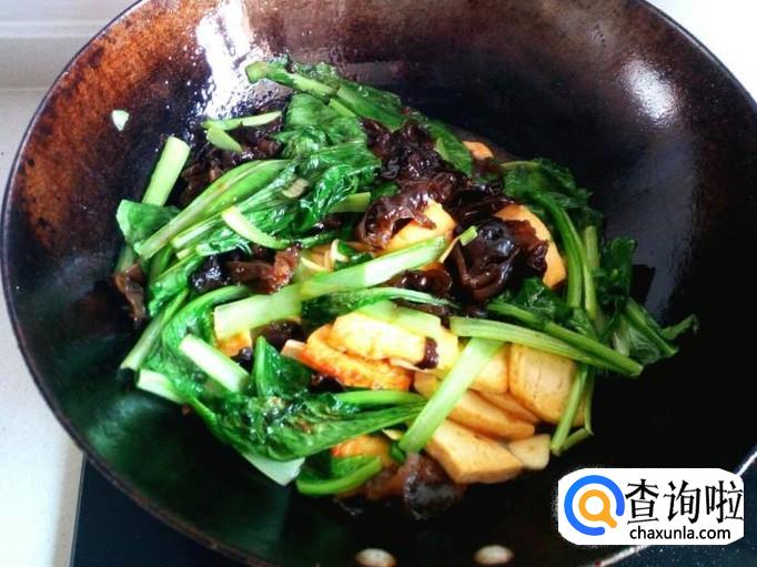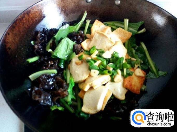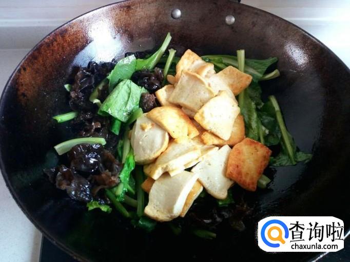 炒至木耳变软后,放入小白菜翻炒至断生,然后放入塌好的豆腐。