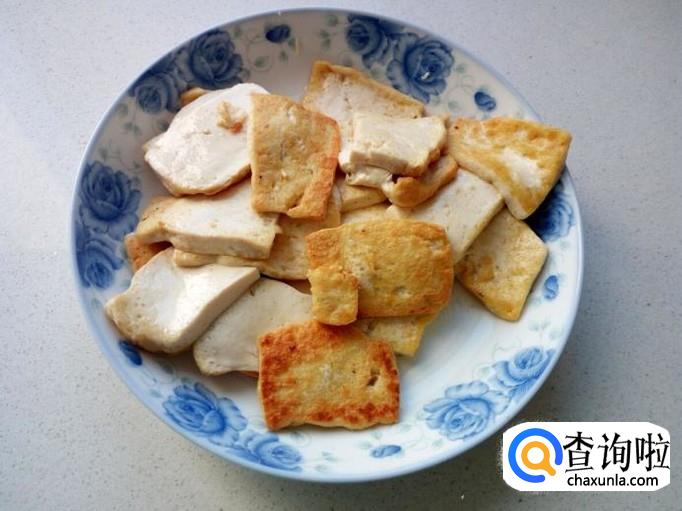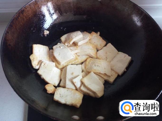 先用锅把豆腐煎塌出来,煎塌至两面微黄,盛出备用(塌豆腐时候,要晃动锅,颠勺翻个,避免用铲刀铲破豆腐)。