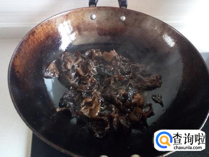 锅内放入油加热,油热后放入花椒爆香,随即放入木耳翻炒,放少许料酒,酱油。