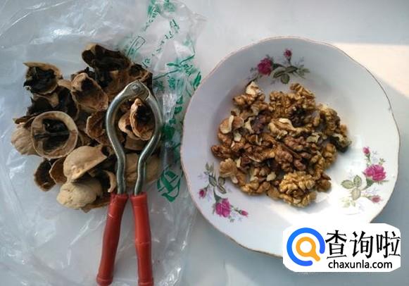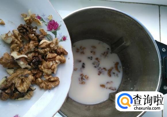 把核桃用夹核桃器夹开后取出核桃仁(约10个核桃),然后把熟花生(用15粒左右)剥出备用。