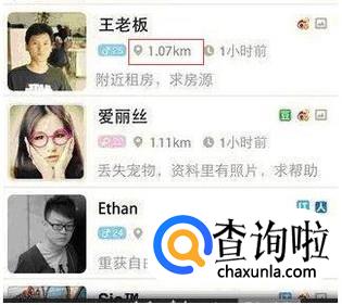 打开陌陌,附近的人。找到你想要查找的人,看他和你的距离为多少,比如,王老板的距离为1.07km