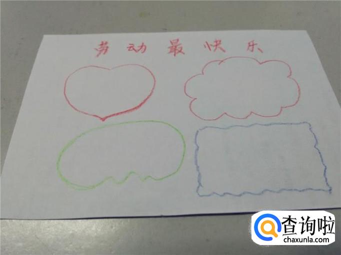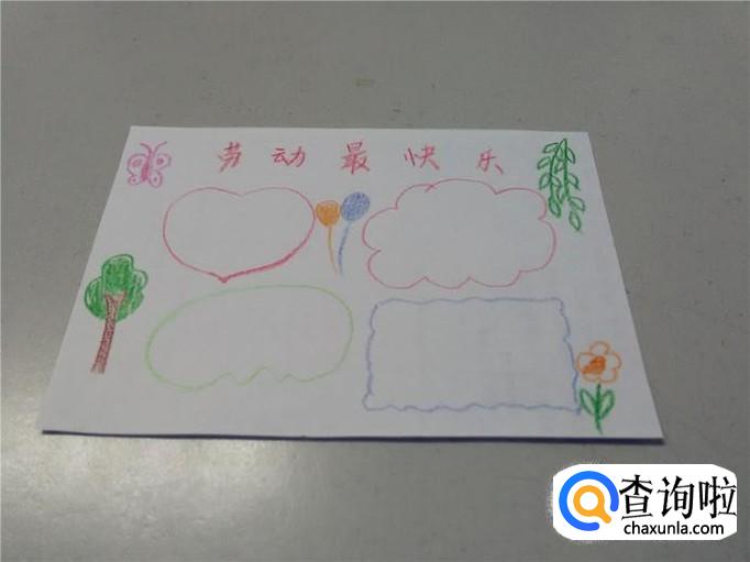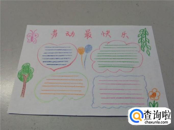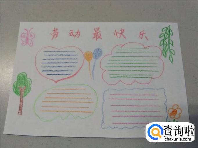 在每个区域里,可以用直尺打上线,这样看着更整齐,然后用水笔或其他笔在每块区域里写上一段和劳动有关的文字,手报就做完了。