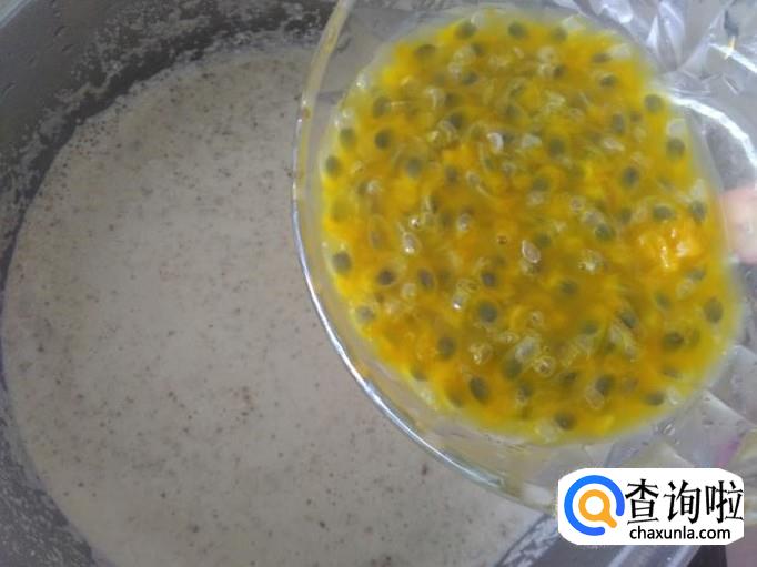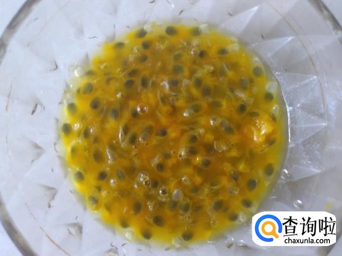 百香果切开,把里面的果肉用勺子挖出来放置碗里。