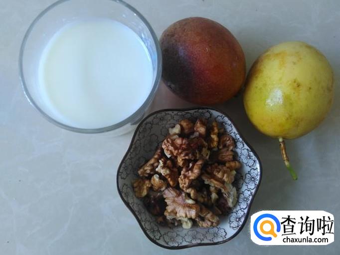 鲜牛奶1杯,百香果2个,核桃30克,白糖适量。