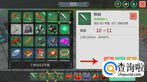 制作完成之后,铁制品工具在背包中就能够查看了,点击装备就能够拿手上,点击“快捷栏”就能够放在快捷栏中方便切换。