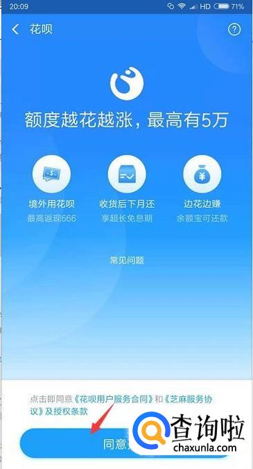 进入花呗后会提示你是否同意开通花呗功能,点击下方的同意开通即可。