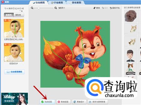 将鼠标放在图片中的小松鼠身上,划两下,小松鼠就被抠下来了,然后点击下面的完成抠图按钮。