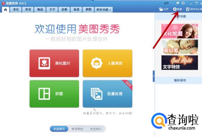 首先打开电脑中的美图秀秀4.0.1版,进入美图秀秀首页,然后点击右上角的新建。