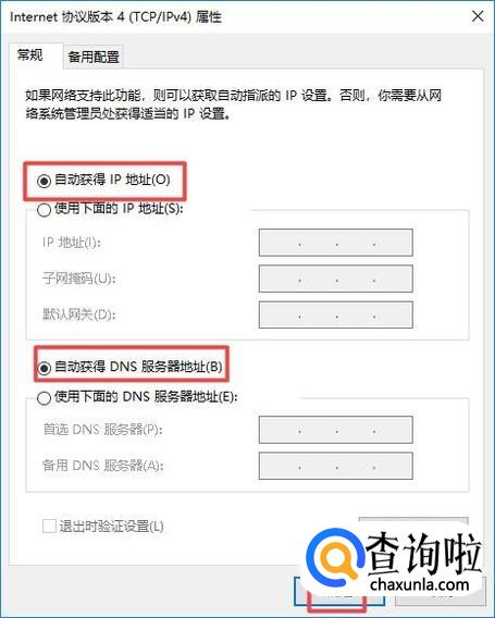 弹出的界面,我们将IP地址和DNS地址全部设置成自动获取的形式,这样我们就解决掉这个问题了。
