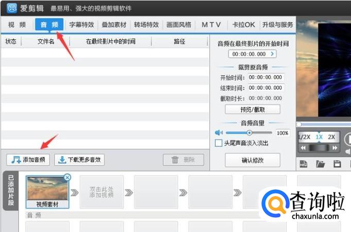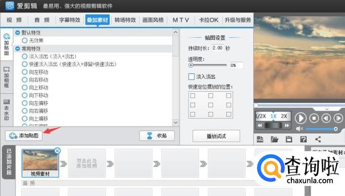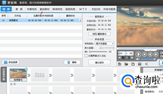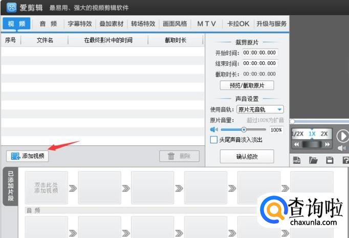 打开爱剪辑软件后,点击“添加视频”按钮,先上传一个视频素材。