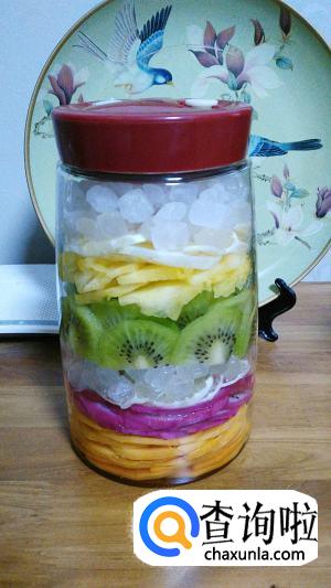 首先我们准备一个干净的玻璃容器,清理干净容器中必须保持无油无水,把所有水果洗净沥干水份削皮待用,火龙果留些红色部分。