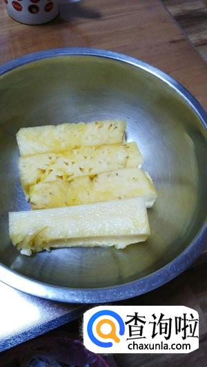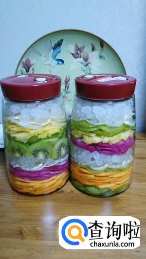 然后把所有的水果按照容器大小切成适度的厚片,放入容器中备用。