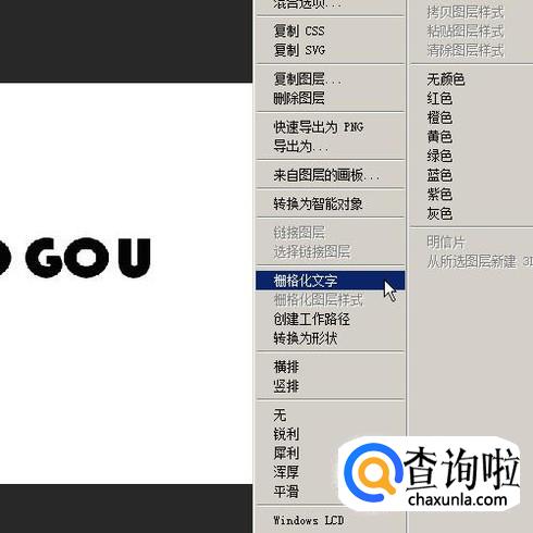 在图层面板这里已自动生成一个文字层,鼠标右击文字层,弹出菜单再点:栅格化文字