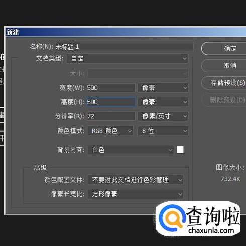 启动PS软件,打开新建文档的界面。点击新建,我们新建一个500X500大小的文档。