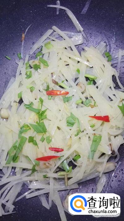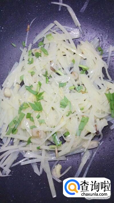 将泡好的土豆丝沥干水分,倒入锅中,搅拌均匀。