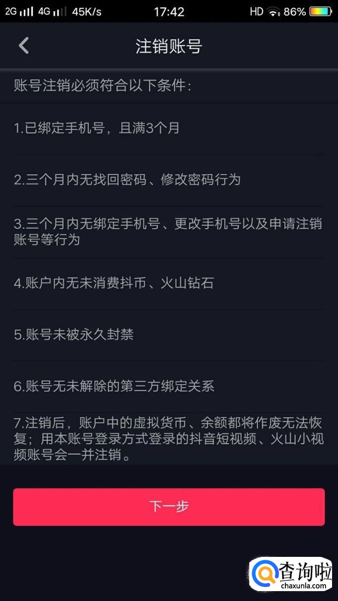 进入之后,满足注销条件,点击下一步,然后点击“发送验证码”,将验证码填好后,点击“下一步”,如图所示。