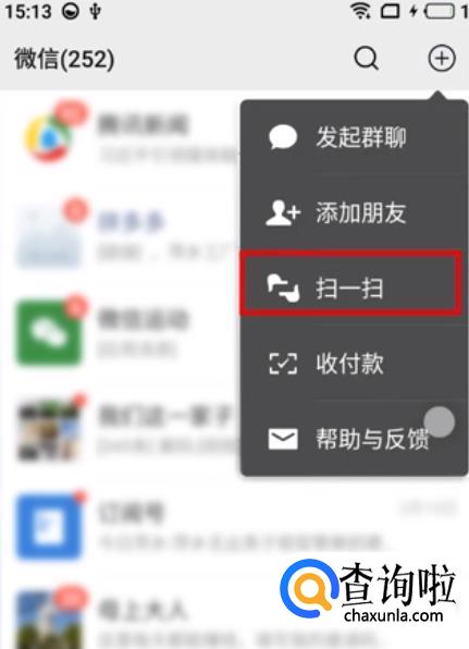 在点击微信界面右上角的“+”,找到扫一扫,点击打开。