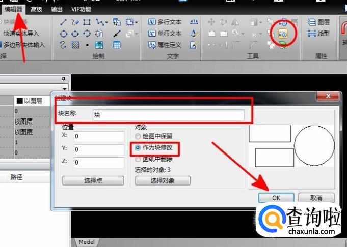 选择完成之后,在“工具”区域找到“创建块”小图标。会弹出一个对话框,然后在块名称输入块的名称,然后在对象列表里面选择“作为块修改”,设置完成之后,点击“OK”按钮。