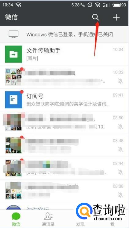 首先我们打开微信界面,点击上方的搜索符号进入。
