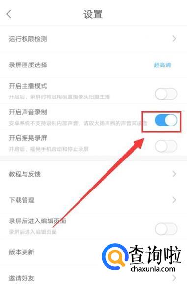 将开启声音录制选项的开关打开即可在录制的时候录制音频。