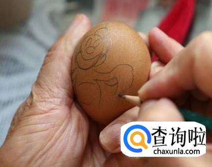 一只手轻轻拿着蛋壳,另一只手用铅笔在蛋壳上轻轻描绘出哆啦A梦的线稿。
