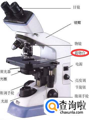 在镜筒下方,形状有方、圆两种,用以放置玻片标本,中央有一通光孔,我们所用的显微镜其镜台上装有玻片标本推进器(推片器),推进器左侧有弹簧夹,用以夹持玻片标本,镜台下有推进器调节轮,可使玻片标本作左右、前后方向的移动。