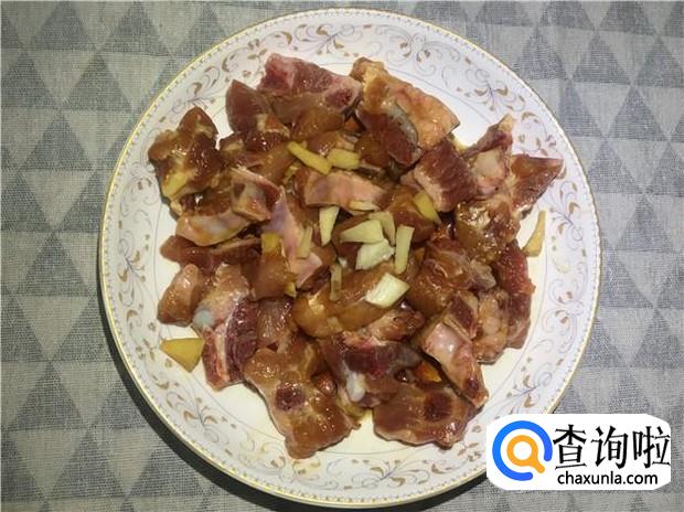 猪小排切小块,清洗干净,加入适量的花生油、酱油、料酒、盐、姜、蒜,搅拌均匀,腌制10分钟。