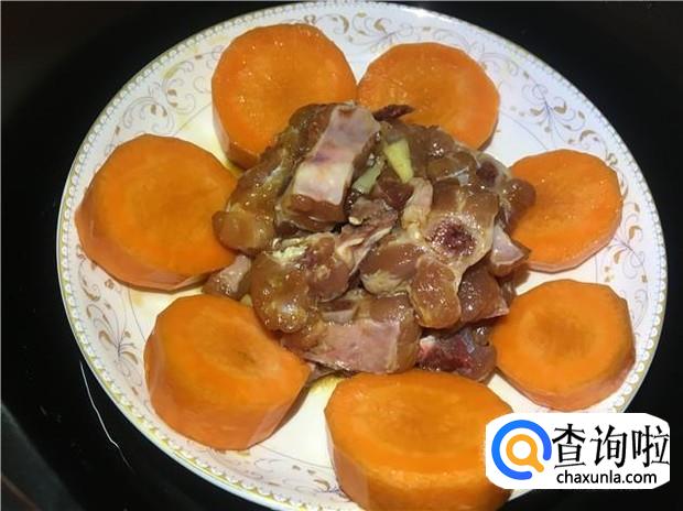 然后先把红萝卜摆一圈,再把腌制好的排骨均匀铺在中间。