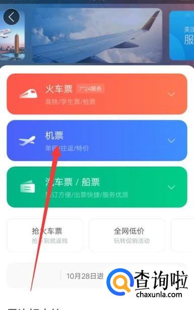 进入之后,选择“机票”,进入下一页面,如图所示。
