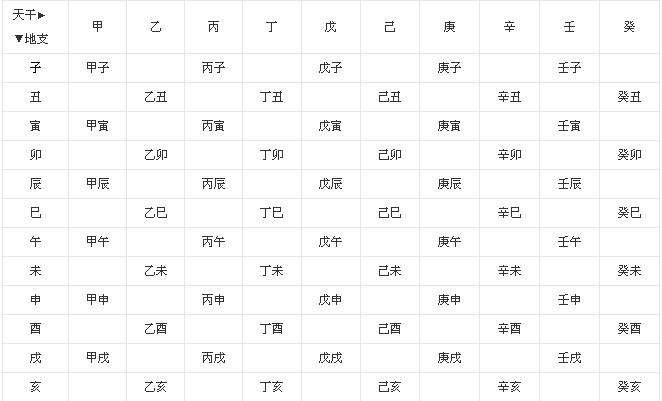 十天干和十二地支进行循环组合:甲子、乙丑、丙寅......一直到癸亥,共得到60个组合,称为六十甲子,如此周而复始,无穷无尽。年月日时都是60一个循环。60在时间领域是个奇妙的数字。不但中国古人用60作为循环,来自西方的计时法中,一分钟是60秒,一小时是60分钟。同样,一天24个小时,和中国传统的每天12个时辰(时辰也就是大时,两个小时为一个大时)对应,中国用5天作为一个时辰的大循环,所谓“五日一候”,共是60个时辰。下面列出六十个干支组合(称为六十甲子):