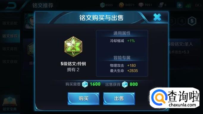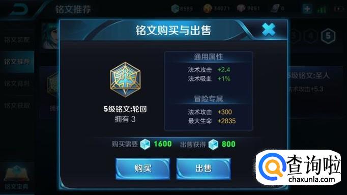 然后,我们来看看她的铭文,蓝色的一般搭配的是轮回,增加她的法术攻击和法术吸血。