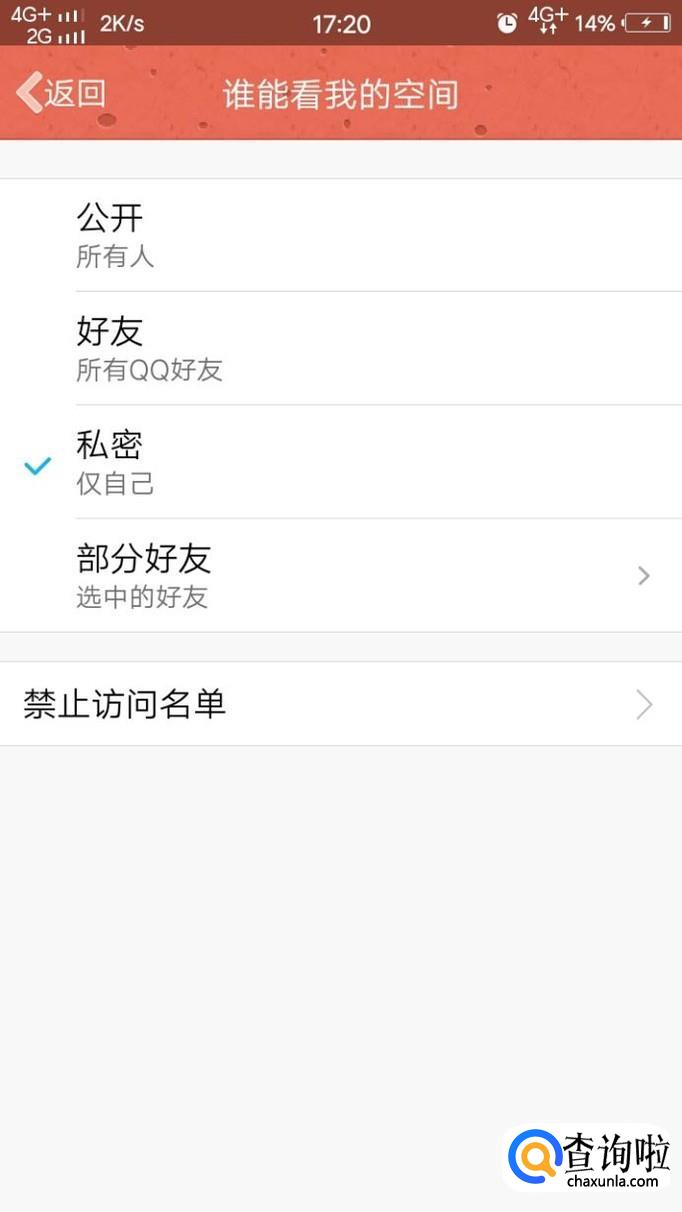 最后,点击动态权限设置,再点击“谁能查看我的空间”,点击“私密”即可。
