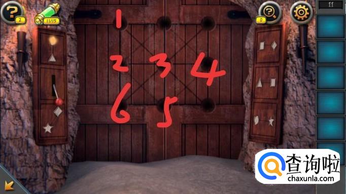 将把手安在门旁边,按墙上的密码提示,照图中顺序依次点击门上的原点即可过关。