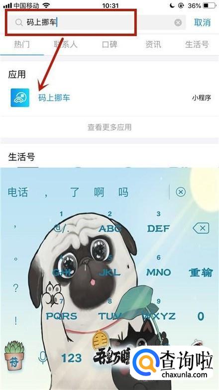 然后输入码上挪车并点击应用码上挪车,如下图所示。