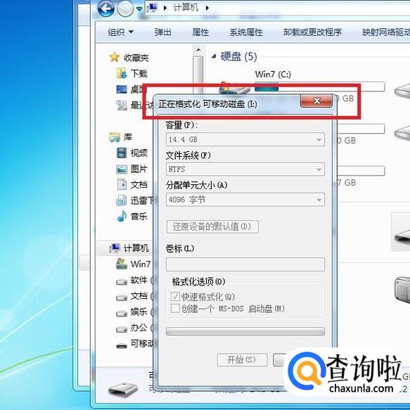 在”快速格式化“前面打勾,选择“开始”对U盘进行格式化处理。