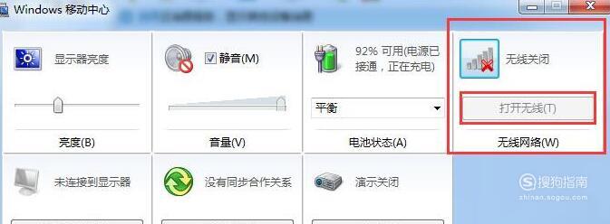 如果仍然没有好,我们需要检查网络接口是否打开。打开控制面板,选择windows移动中心,再点击“打开无线”就可以了。