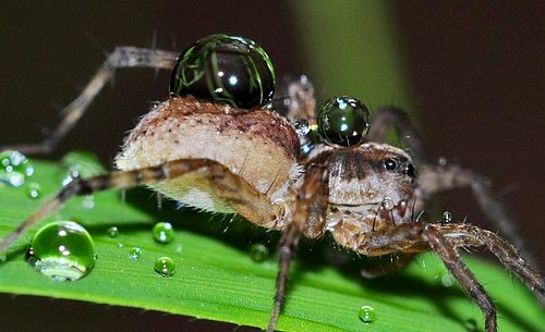 不同的蜘蛛躲雨的方式也不一样,一般都是会在下雨之前寻找一个相对比较安全的场所进行躲避的。自己织网的蜘蛛会根据自己织网的地点寻找合适的叶子或者墙缝躲避;有窝的蜘蛛则会返回窝里躲藏;四处游走的蜘蛛们会随便找一个蔽体地方进行避雨。