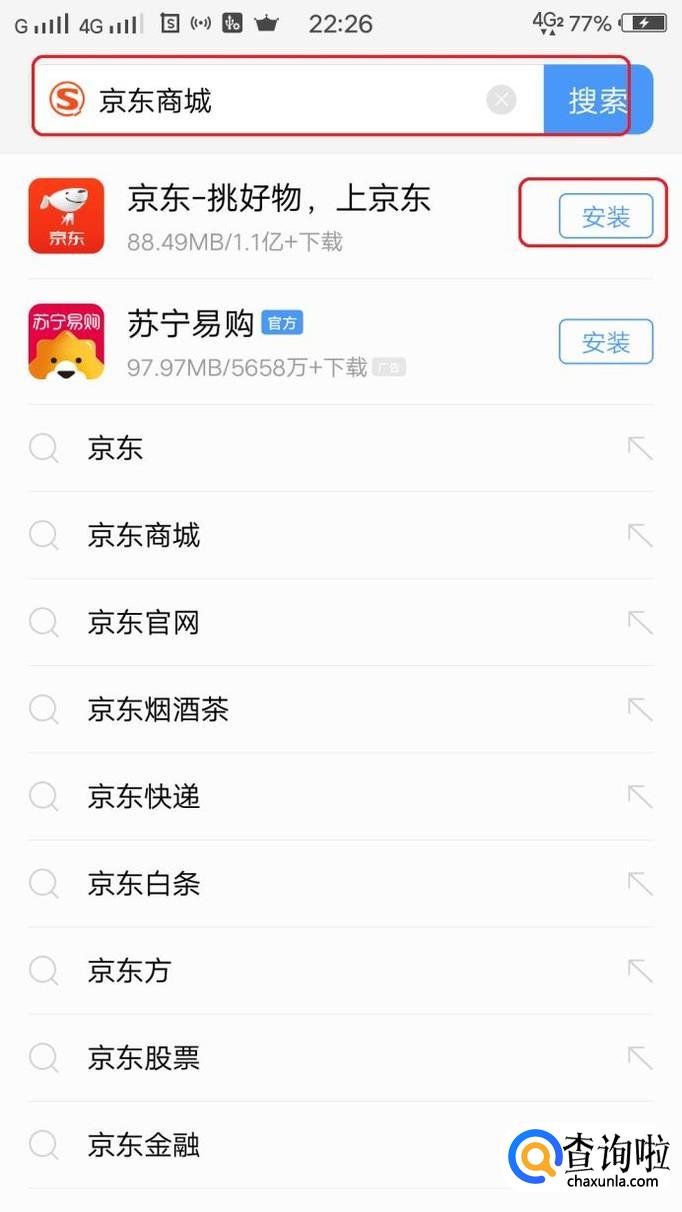 首先,需要下载京东app,如图所示,只需在浏览器搜索“京东商城”,即可下载、安装。