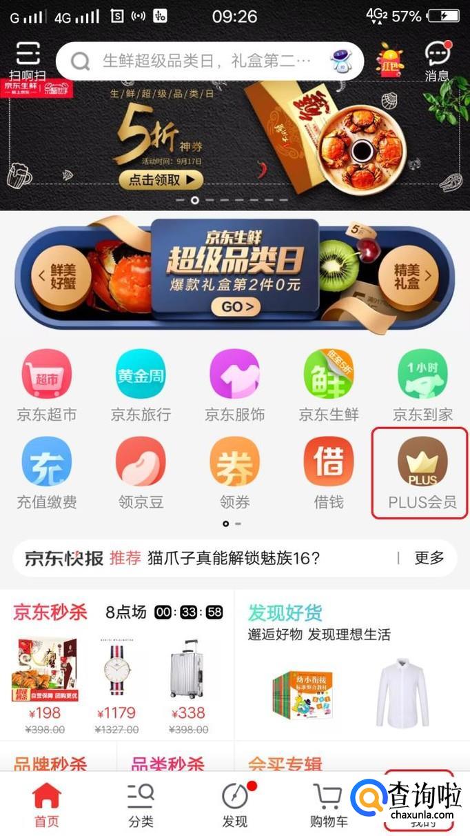 打开app,需要先点击右下角“我的”,登录一下,回到首页,在中间位置就能看到“PLUS会员”图标,如图所示,点击一下。