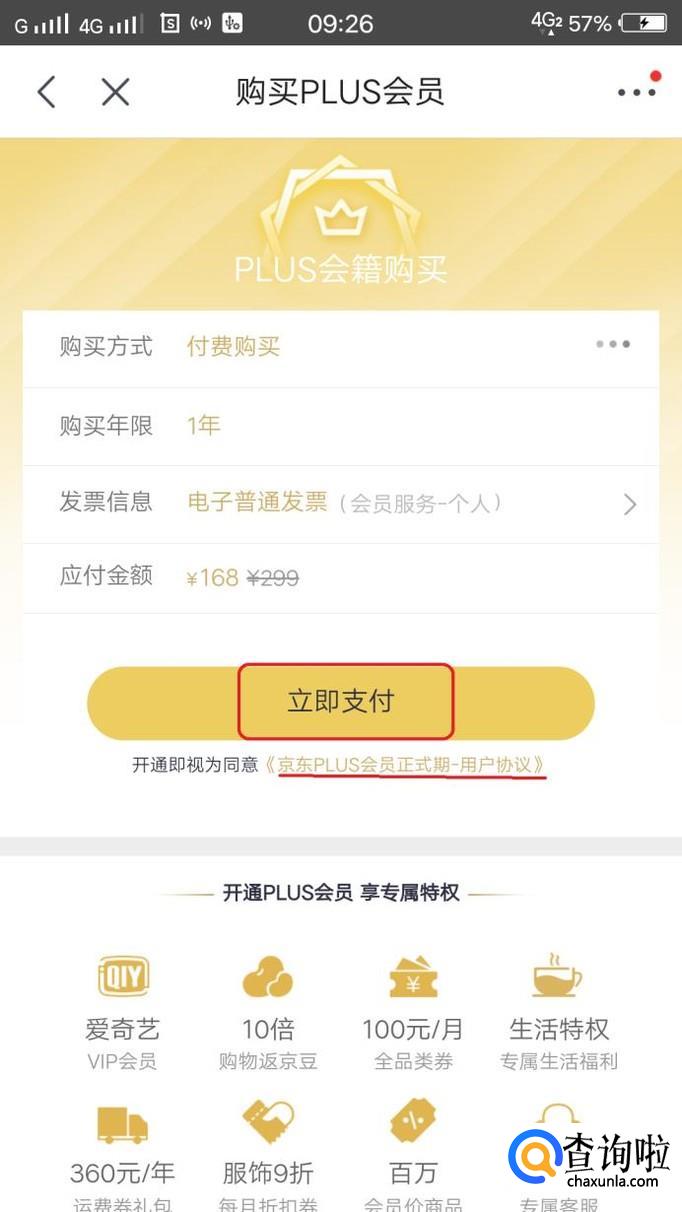 可以点击“用户协议”,看一下双方的权责,点击“立即支付”,付完款后,就能开通plus会员了。
