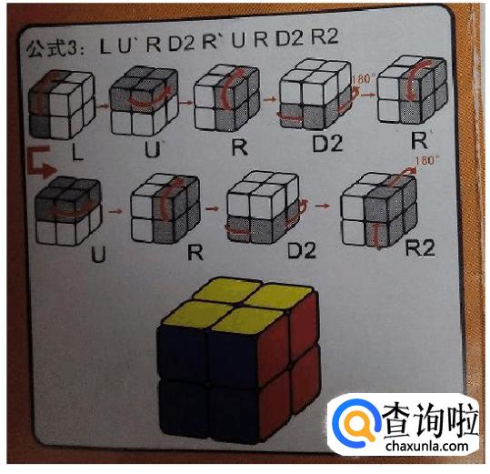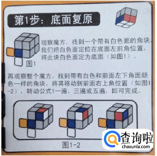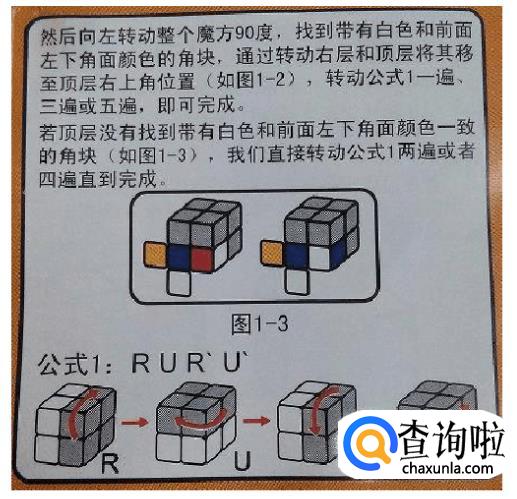 若顶层没有找到带有白色和前面左下角面颜色一致的角块(如图1-3),我们直接转动公式1两遍或者四遍直到完成。