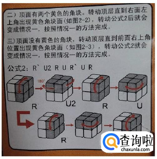 二)顶面有两个黄色的角块。转动顶层直到右面左上角出现黄色角块面(如图2 -2),转动公式2后就会变成情况一,按照情况一的方法完成。
