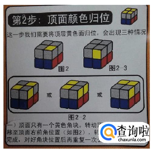 一)顶面只有一个黄色角块。转动顶层将黄色的角块移至顶面右前角位置(如图2),转动公式2。若没有完成,对好角块位置后再重复一次公式2,即可完成。