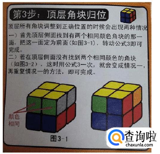 二) 若在顶层侧 面没有找到两个相同颜色的角块(如图3-2),这时用公式3一次,就会变成情况一,再重复情况一的方法, 即可完成。
