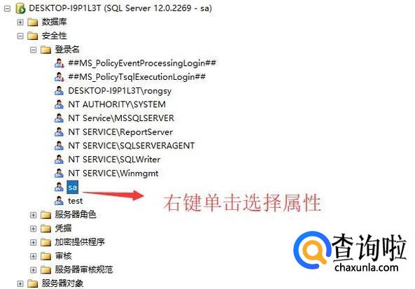 接下来点击数据库的安全性,展开其下面的登录名,找到sa账号,右键单击选择属性,如下图所示