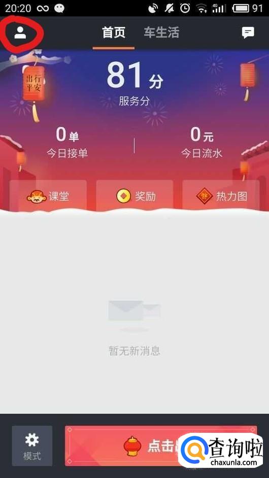 打开滴滴车主APP首页,点击下图红圈所示位置进入车主个人首页。