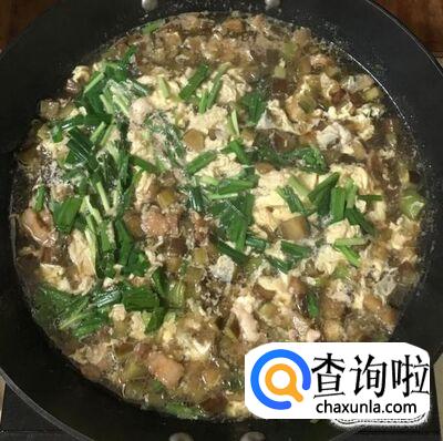 均匀的淋入鸡蛋液后用汤勺轻轻搅拌均匀即可关火,撒入韭菜段根据个人喜好加入少许鸡精调味