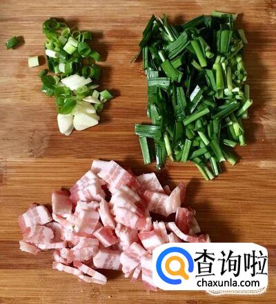 葱、蒜、韭菜择洗干净分别切成葱花、蒜片、韭菜段,五花肉切片备用,鸡蛋三个打入碗中搅拌均匀成蛋液